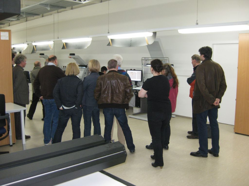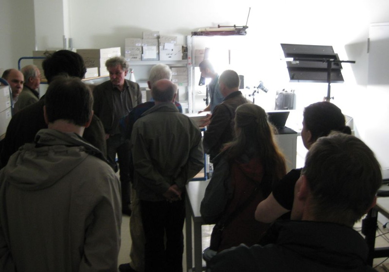 In Anschluss an die Sitzung führte Dr. Andreas Berger die Gruppe durch das Restaurierungs- und Digitalisierungszentrum des Stadtarchivs in Köln-Porz. Die Gruppe folgte dabei den Weg des Archivgutes von der Anlieferung bis zur Digitaliserung.