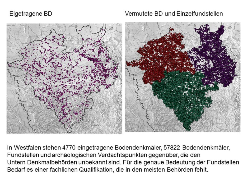 Dr. Sandra Peternek: „Im Zuge der Anhörung sind die unteren Denkmalbehörden verpflichtet, uns einen validen Entscheidungsvorschlag vorzubereiten. Das heißt, sie müssen alle Belange der Bodendenkmalpflege berücksichtigen, was sie aber de facto nicht können. Das kann im schlimmsten Fall dazu führen, dass allein in Westfalen fast 60.000 Denkmäler zerstört werden könnten. Für ganz NRW sind das über 100.000 Denkmäler und NRW als größtes Bundesland ist dabei nur der Anfang. Das heißt, auch andere Bundesländer werden von dieser Entwicklung betroffen sein. In den schlimmsten Fällen müssten wir Baustopps verhängen, also das Gegenteil von dem, was das Gesetz bringen soll.“