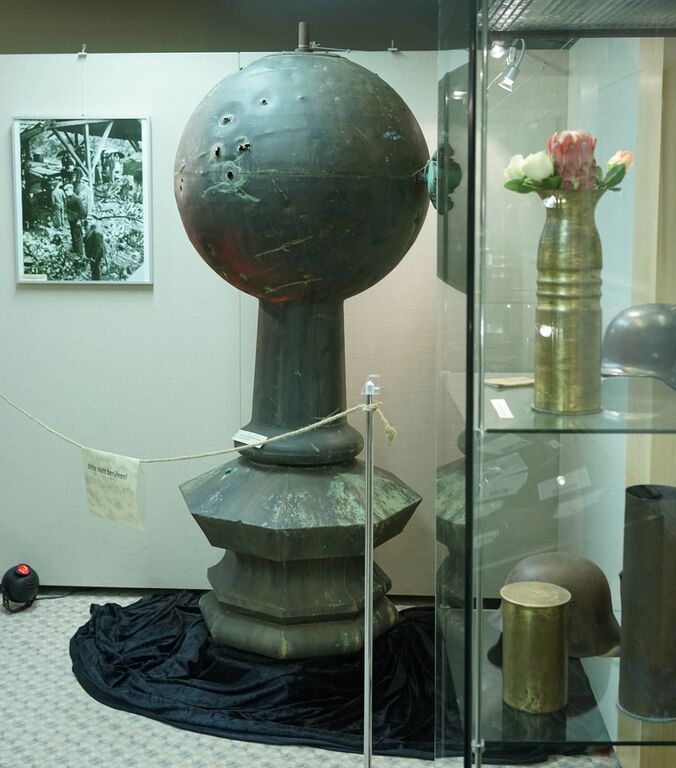 Wieder einmal ist es den Brüdern Ermert gelungen, Exponate aus den Herdorfer Haushalten zu besorgen. Doch damit nicht genug. Größtes Exponat ist die einstige Spitze des Herdorfer Kirchturms – durchlöchert vom Beschuss im Zweiten Weltkrieg.