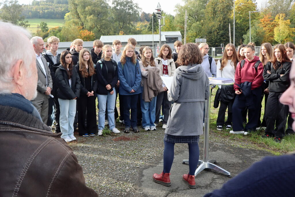 Margit Haars als stellvertretende Vorsitzende des Freundeskreises für Christlich-Jüdische Zusammenarbeit Bad Laasphe und Bürgermeister Dirk Terlinden eröffneten die Ausstellung neben dem Bahnhof vor Schülerinnen und Schülern des örtlichen Städtischen Gymnasiums. Foto: Jens Gesper