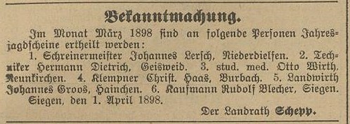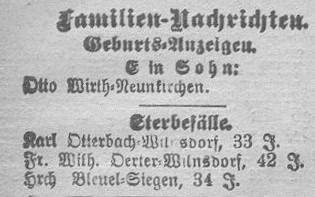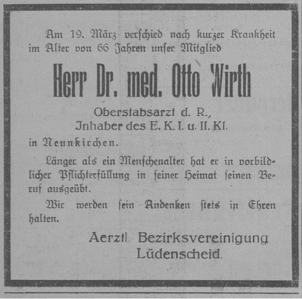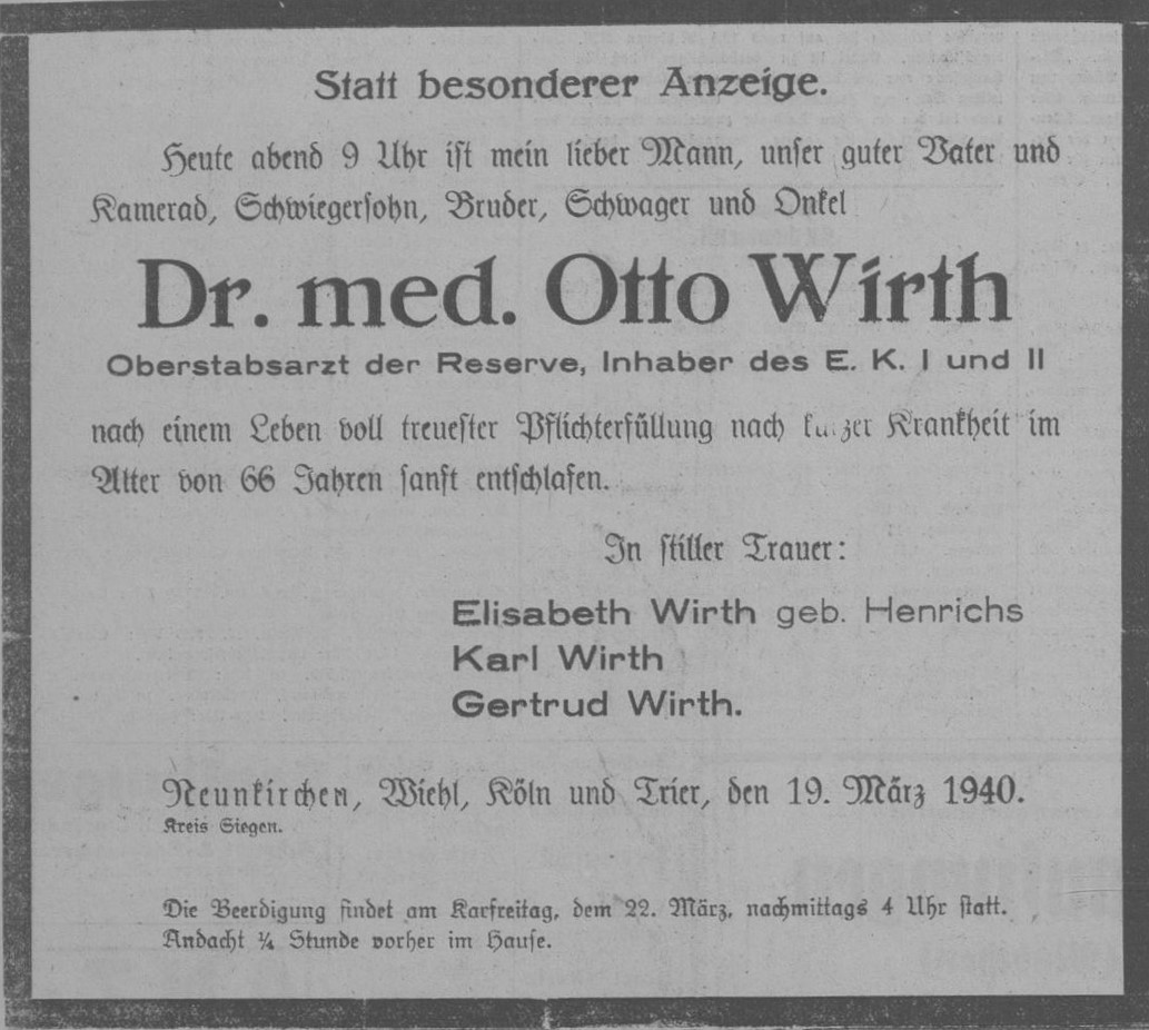 Otto Wirth wurde am 3. September 1873 als Sohn des praktischen Arztes Dr. med. Carl Wilhelm Wirth in Neunkirchen geboren. Er besuchte die Gymnasien in Attendorn und Dortmund, wo er auch im Frühjahr 1897 sein Abitur ablegte. Wirth studierte zwischen 1897 und 1903 an den Uni-versitäten Gießen, Erlangen und München Medizin. Im Sommersemester 1901 kehrte er nach Gießen zurück und promovierte dort 1903 zu einem augenheilkundlichen Thema. 1907 wurde Wirth als Nachfolger seines Vaters von der Amtsvertretung Burbach zum Schulrevisions- und Armenarzt gewählt. 1912 heiratete er in Neunkirchen die aus Neunkirchen-Salchendorf staamende Charlotte Elisabeth Henrichs. Im Jahr darauf wurde ein Sohn geboren. Otto Wirth wurde das Eiserne Kreuz I. und auch II. Klasse verliehen. Sein letzter militärischer Rang war Oberstabsarzt der Reserve. Zwischen 1925 und 1940 befand sich seine Praxis in der Bahnhofstr, 299 in Neunkirchen. Im März 1898 gab Landrat Schepp bekannt, dass Otto Wirth einen Jahres jagdschein erteilt wurde.
