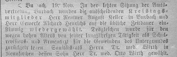 1930 zählte Dr. Otto Wirth zu den Gründungsmitgliedern der NSDAP-Ortsgruppe Neunkirchen. Ferner gehörte er den SA-Sturm 5/130 an und bekleidete dort das Amt des Scharführers. Am 19. März 1940 verstarb Otto Wirth nach kurzer Krankheit.