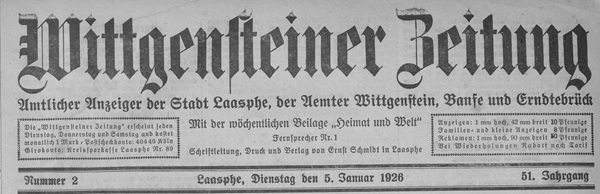 Die „Wittgensteiner Zeitung“ ist in das NRW Zeitungsportal eingestellt worden. Es handelt sich um ein umfangreiches Blatt mit längerer Laufzeit, unterschiedlichen Titeln, Paralleltiteln und Beilagen. Die Ausgaben sind direkt aus Privatbesitz digitalisiert worden.