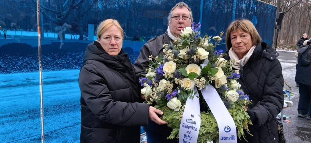 Mit einem Kranz am T4-Gedenkort in Berlin erinnerten am 28. Januar Lebenshilfe-Vertreter*innen an die Opfer der NS-„Euthanasie“. Von links: Dagmar Schmidt, MdB und Mitglied im Bundesvorstand der Lebenshilfe, Christian Specht, Selbstvertreter und Mitglied im Landesvorstand der Lebenshilfe Berlin, und Bundesvorsitzende Ulla Schmidt, Bundesministerin a.D. © Lebenshilfe/Peer Brocke