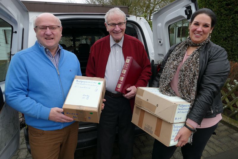 Anfang der vergangenen Woche trafen sich die Stadtarchivarin Verena Hof-Freudenberg, ihr Vorgänger Reinhard Gämlich und die Pressebeauftragte der Stadtverwaltung Annette Branß in Kreuztal-Eichen bei Manfred Hofmann, um seine umfangreiche postgeschichtliche Sammlung abzuholen. Die Übergabe der insgesamt 15 Kartons war schon lange abgesprochen und von Manfred Hofmann sorgsam vorbereitet worden.