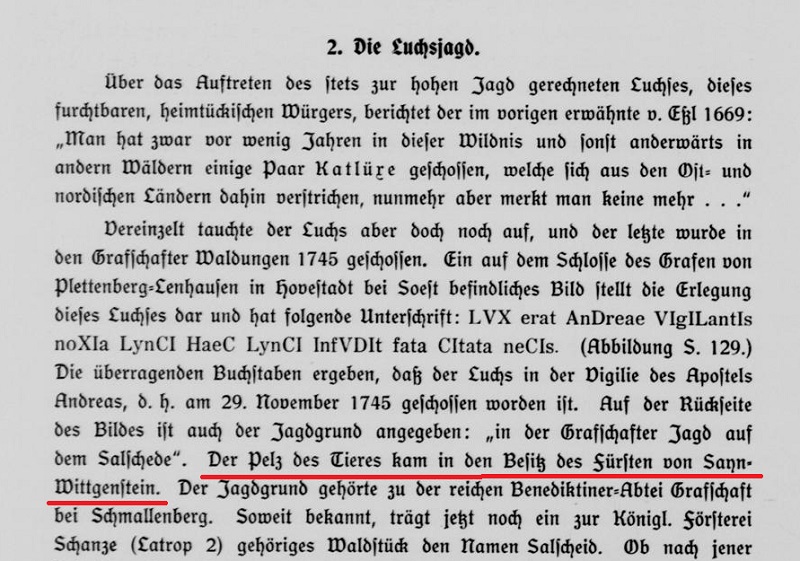 “ …. Es soll einst ein Luchs im Amte Runkel (Westerwald, Anm. d.Verf.) geschossen worden seyn, jedoch habe ich keine sichere Nachricht über diesen Gegenstand erhalten. Im Wittgenstein-Berleburgischen hat man einen Luchs erlegt, dessen Felle noch unlängst auf der dortigen Gewehrkammer des Fürsten aufbewahrt wurde. Er wurde bei Grafschaft in den 1760er Jahren zufällig im Sommer zufällig von einem im Walde ruhenden Jäger geschossen, neben dem er plötzlich von einem Baume herab auf die Erde sprang ….“