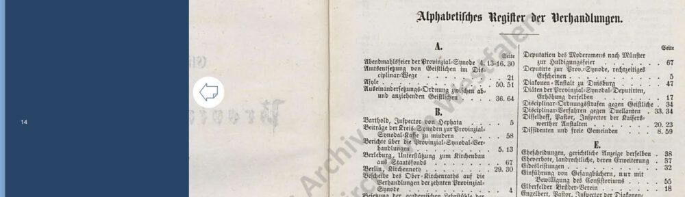 Seit dieser Woche stehen im Archivportal NRW die Digitalisate der Protokolle der westfälischen Provinzialsynoden (1819, 1835-1934), der westfälischen Bekenntnissynoden (1934-1936) und der ersten Landessynoden der Evangelische Kirche von Westfalen (1948-1949) zur Verfügung. Weitere Digitalisate der Landessynoden werden in den nächsten Monaten folgen.