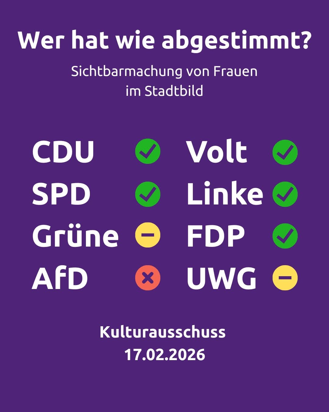Auch sehen Linke und FDP einen Verfahrensfehler. In der Mitteilung heißt es: Der Kulturausschuss habe bei seiner Entscheidung die Ergebnisse des eigens für das Frauendenkmal eingerichteten Arbeitskreises nicht ausreichend berücksichtigt. …
