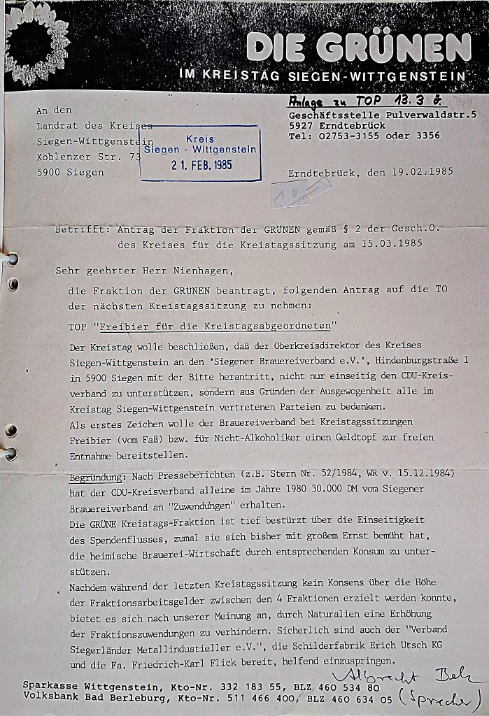 Vor 40 Jahren: Freibier im Kreistag – ein ironischer Antrag der GRÜNEN