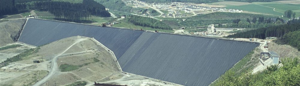 Hauptdamm der Biggetalsperre während der Asphaltabdichtung mit Attendorn Neu-Listernohl im Hintergrund, Attendorn ca. 1960
